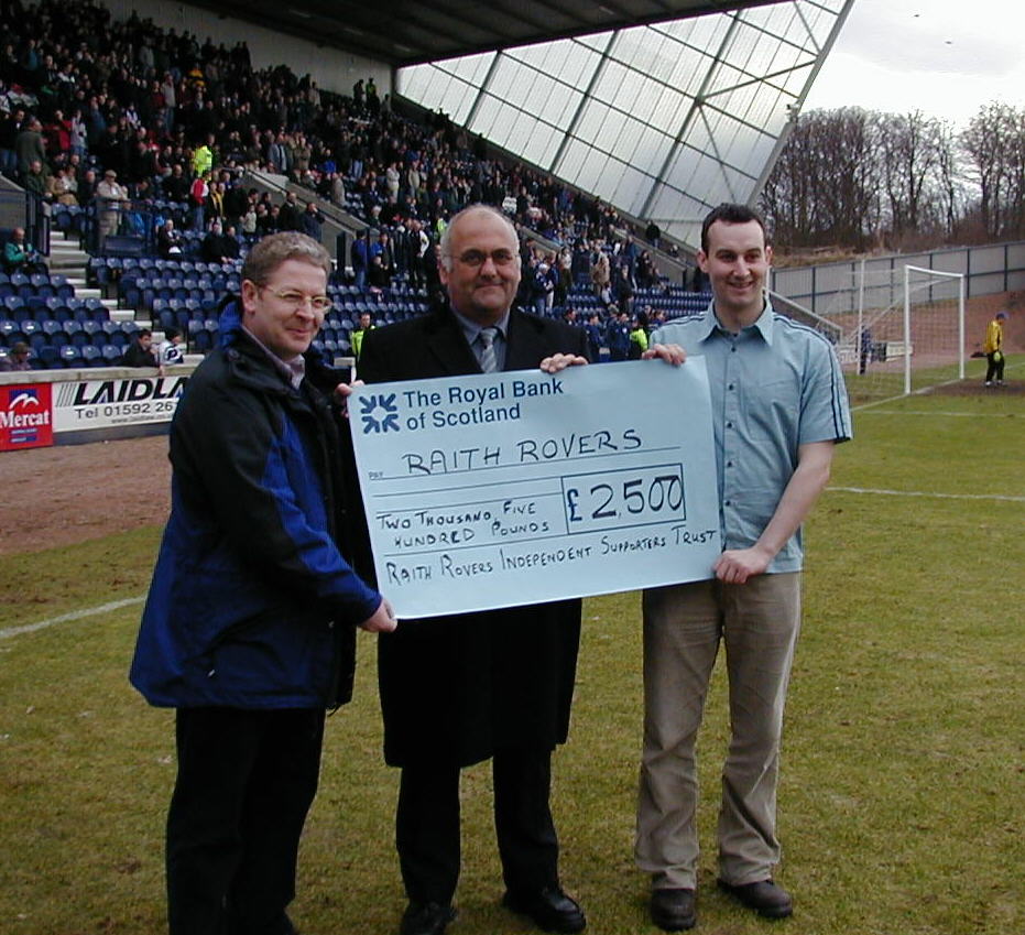 Our photograph shows Supporters Trust Steering Committee members George Howie (left) and James Proctor (right) handing over a cheque for £2,500 to Raith Rovers Chairman, Willie Gray (centre) at half-time in the match versus Inverness Caledonian Thistle.