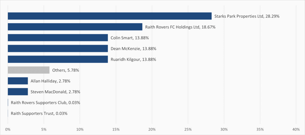 Raith Rovers FC Ltd is “the club” (i.e. it holds SFA and league membership). There are lots of marginal, mostly historical, shareholdings with little decision-making power or influence.